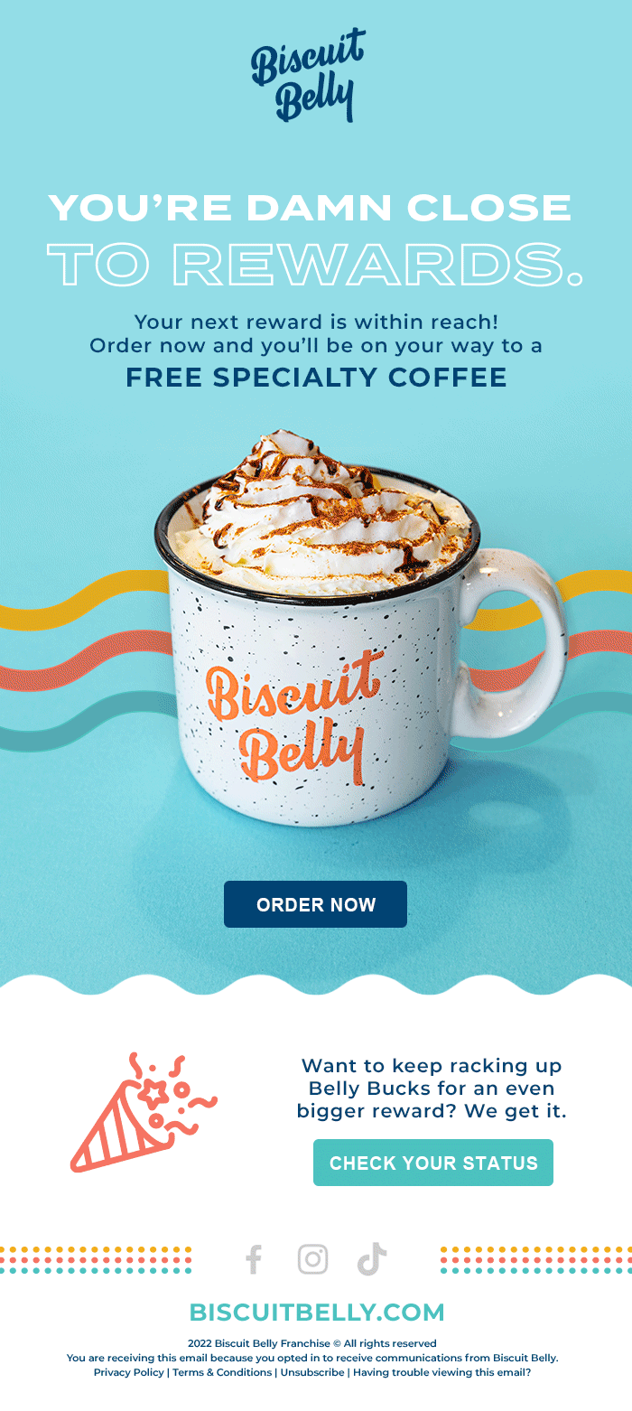 What do you do when your loyalty program has gone a little stale? You call on us for a complete loyalty program revamp. For Biscuit Belly's Loyalty Campaign, full-journey messaging was created. From pop-ups on the website home page and a new Loyalty landing page, to in-store POP and a dynamic series of emails, the program turned both new and loyal customers alike into Loyalty Program users.